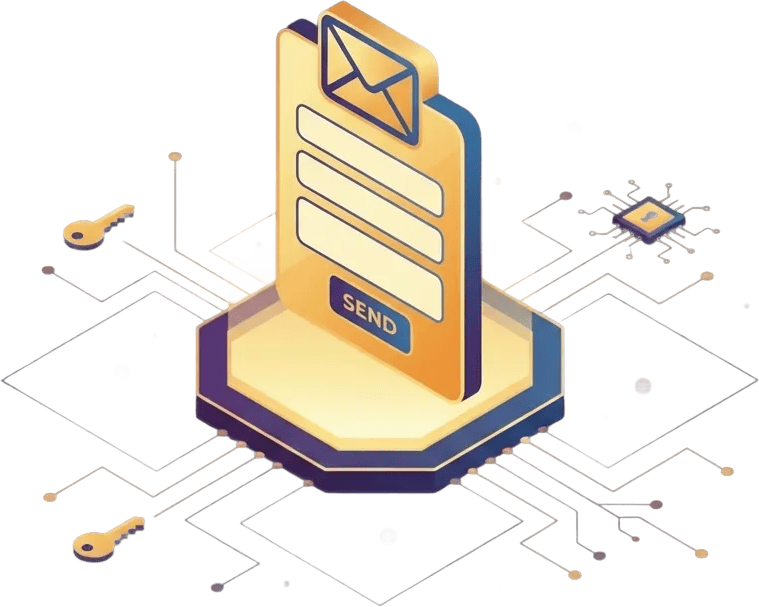 Isometric illustration of a digital send form with an envelope icon, surrounded by circuit lines, keys, and a microchip, representing secure online communication or encrypted email.