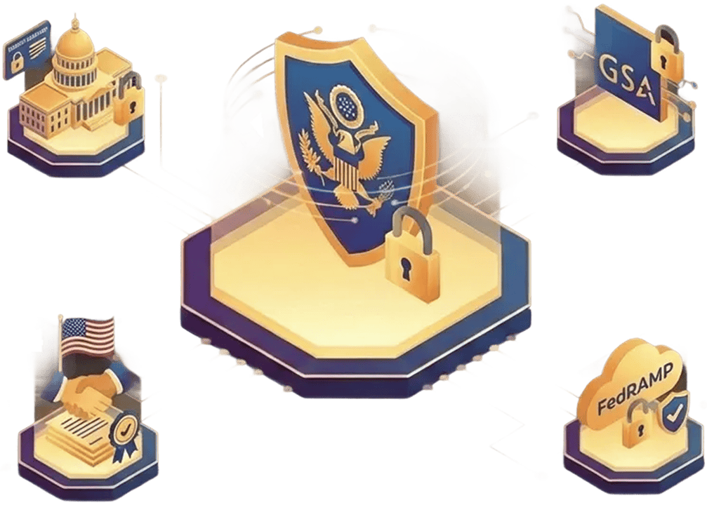 Isometric graphic with five icons: a shield with an eagle and a lock in the center, a government building with a checkmark, a handshake with an American flag, a GSA sign, and a FedRAMP badge with a checkmark.